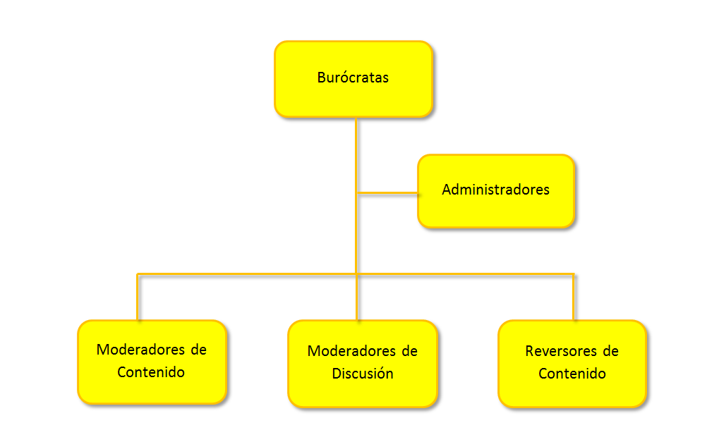 En este esquema se puede mostrar cómo debería componerse la administración de un wiki, por lo que puede ser de mucha utilidad al momento de contactar algún usuario que cuente con ciertos niveles específicos. Aquí se explicarán lo que cada rango debe tener y las posibilidades que éste posee: